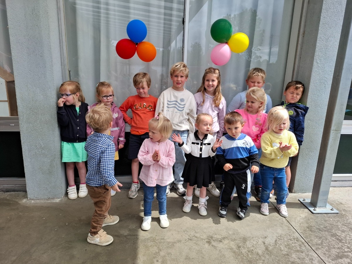 De kleuters genoten van hun verjaardagslied. In het lager mochten Leon, Ruis, Brecht, Leon, Ella, Lotte, Lena en Elif samen op de foto!